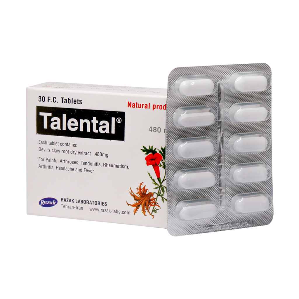 افزودن به لیست مقایسهقرص روکشدار تالنتال ۴۸۰ میلی گرم رازک دارای ترکیبات گیاهی مفیدی است که در لابراتوارهای حرفهای شرکت داروسازی رازک ساخته شده و خاصیت ضد درد قوی دارد. این قرص برای تسکین دردهای زیادی از بدن از جمله دردهای اسکلتی مانند آرتروز، روماتیسم، میگرن، سر درد و کاهش تب نیز مؤثر است. پنجه شیطان، گیاه مختص جنوب آفریقا است و قلابهایی که میوههای آن را در بر میگیرند، دلیل نام گذاری آن نام هستند. محققان دریافتهاند که ریشه پنجه شیطان میتواند التهاب و درد را کاهش دهد. این گیاه با خواصی که دارد میتواند دردهای اسکلتی- عضلانی را کاهش و تسکین دهد. برای افراد مسن و همچنین برای افرادی که از دردهای ذکر شده رنج میبرند استفاده از محصولاتی که دارای این عصاره هستند مناسب است. این قرص بهترین دارو برای استخوان درد به شمار میآید.
